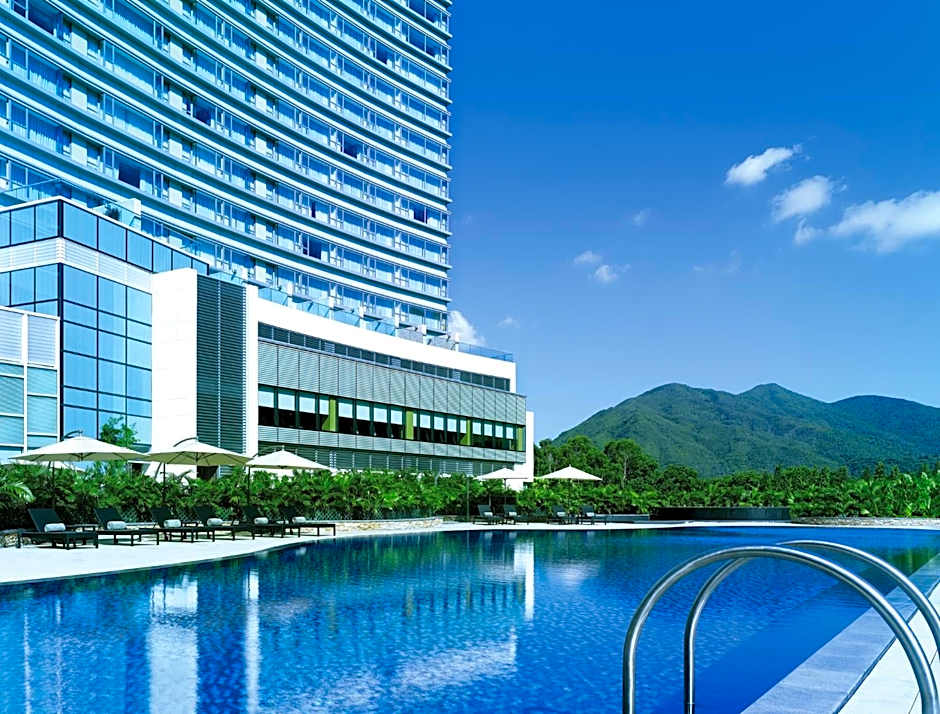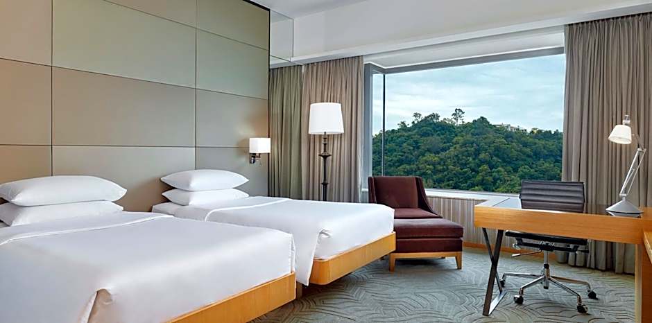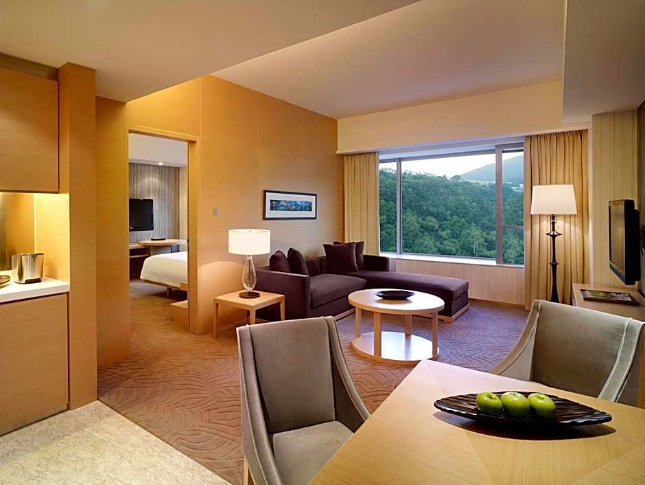 This 72-square-yard room, with one bedroom and a separate living area, featuring relaxing mountain views, includes a king-sized bed, extra closet space, a dining table, refrigerator and guest toilet. There is also a kitchenette equipped with a microwave, a range hood and a sink. It has contemporary decor featuring photographic montages of old and new Hong Kong, plus 42-inch multi-channel LCD flat-screen TV and wired and wireless broadband Internet access.