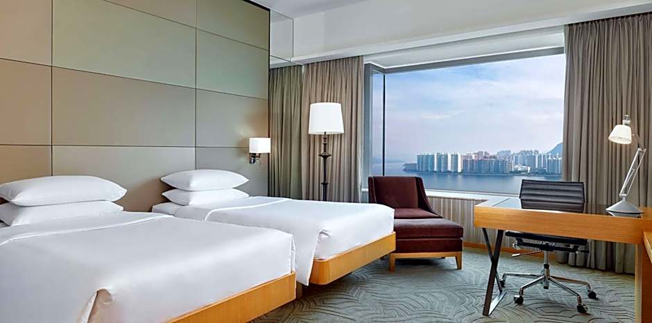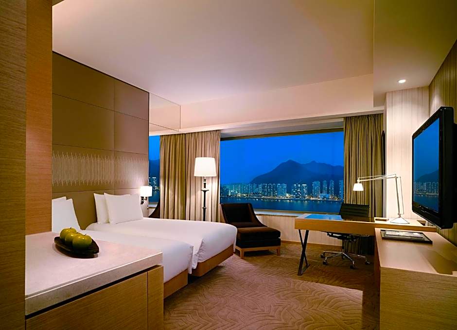 Offering harbor views, this 36-square-yard room comes with twin beds and writing desk with enhanced lighting, a bathroom with glass wall with a TV, alongside a separate rainshower. It also has contemporary decor with photographic montages of old and new Hong Kong, plus 42-inch multi-channel LCD flat-screen TV and wired and wireless broadband internet access.