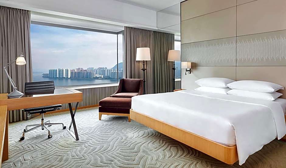 Offering harbor views, this 35-square-yard room comes with a king-sized bed and writing desk with enhanced lighting, a bathroom with glass wall with a TV, alongside a separate rainshower. It also has contemporary decor with photographic montages of old and new Hong Kong, plus 42-inch multi-channel LCD flat-screen TV and wired and wireless broadband internet access.